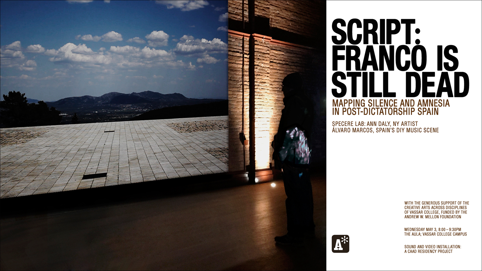 As the semester draws to a close, CAAD has been busy collaborating with artist duo SPECTRE LAB for their installation this week. A collaboration between interdisciplinary artist Ann Burke Daly and musician and writer Álvaro Marcos, SPECTRE LAB will be presenting Script: Franco is Still Dead, a multi-channel sound and video installation in the Aula. In conversation with Professor Katherine Hite’s Political Science course “The Politics of Memory” and Professor and Chair of Hispanic Studies Michael Aronna’s course on literature and culture, this project touches on topics of history, erasure, and memory in the context of modern Spain. Things are well underway with their installation and we are eagerly awaiting the final unveil this Wednesday.