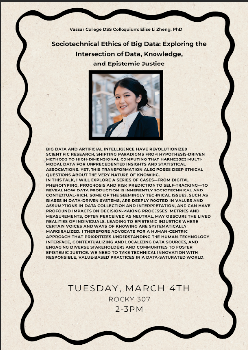 3/4/2025Elise ZhengColumbia UniversityPostdoctoral FellowSociotechnical Ethics of Big Data: Exploring the Intersection of Data, Knowledge, and Epistemic Justice Rockefeller 3072:00