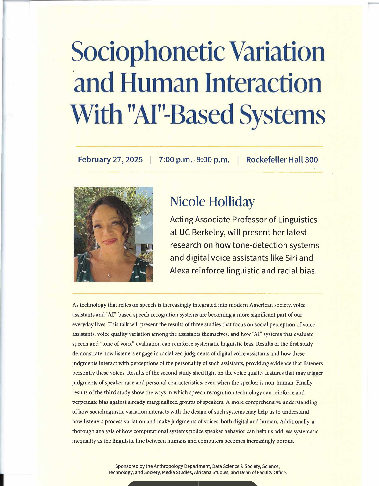 2/27/2025Nicole HollidayUC BerkeleyActing Associate Professor of LinguisticsSociophonetic Variation and Human Interaction with “AI”-Based SystemsRockefeller 3007:00