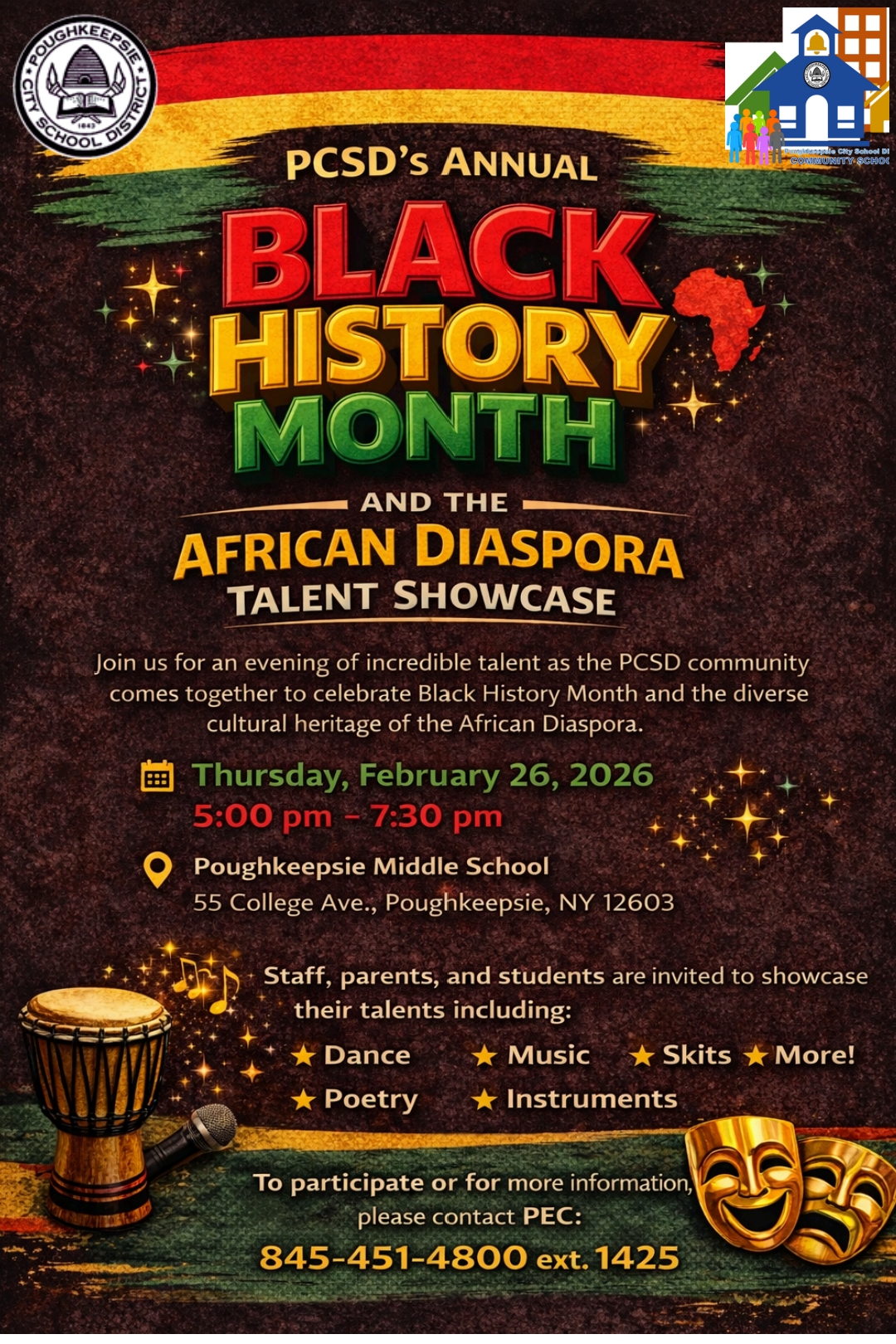 Join Poughkeepsie City School District for an evening of incredible talent as the PCSD community comes together to celebrate Black History Month and the diverse cultural heritage of the African Diaspora.