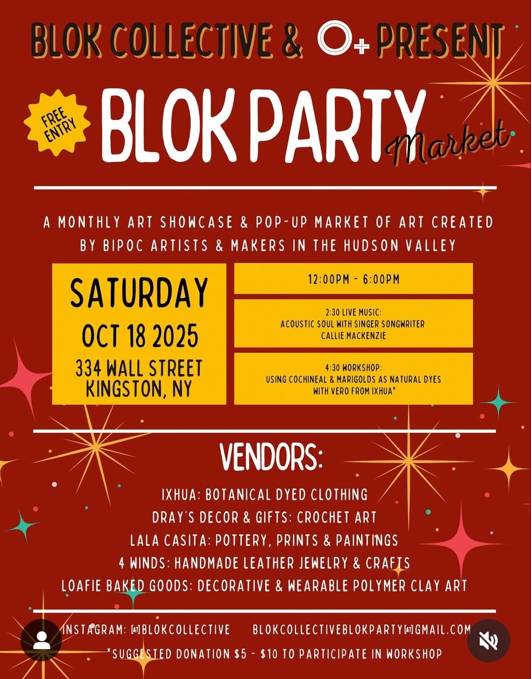 « All Events This event has passed. BLOK PARTY October 18, 2025 @ 12:00 pm - 6:00 pm « NO KINGS, Poughkeepsie, NY Artist Talk with Robin Hutchinson » Add to calendar Google Calendar iCalendar Outlook 365 Outlook Live Details Date: October 18, 2025 Time: 12:00 pm - 6:00 pm Organizers Blok Collective O+ Festival Venue O+ Exchange Clinic 334 Wall Street Kingston, + Google Map