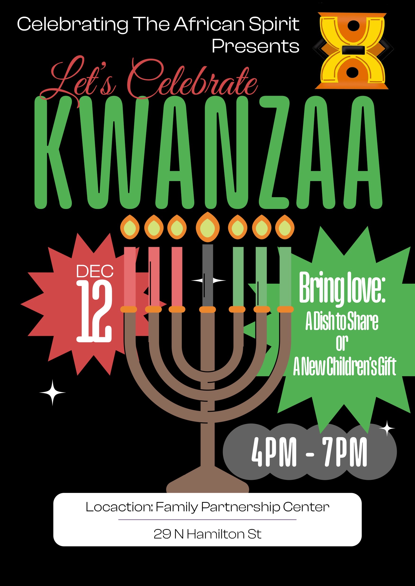 Celebrate Kwanzaa with Celebrating the African Spirit. Bring a dish to share or a new children’s gift.