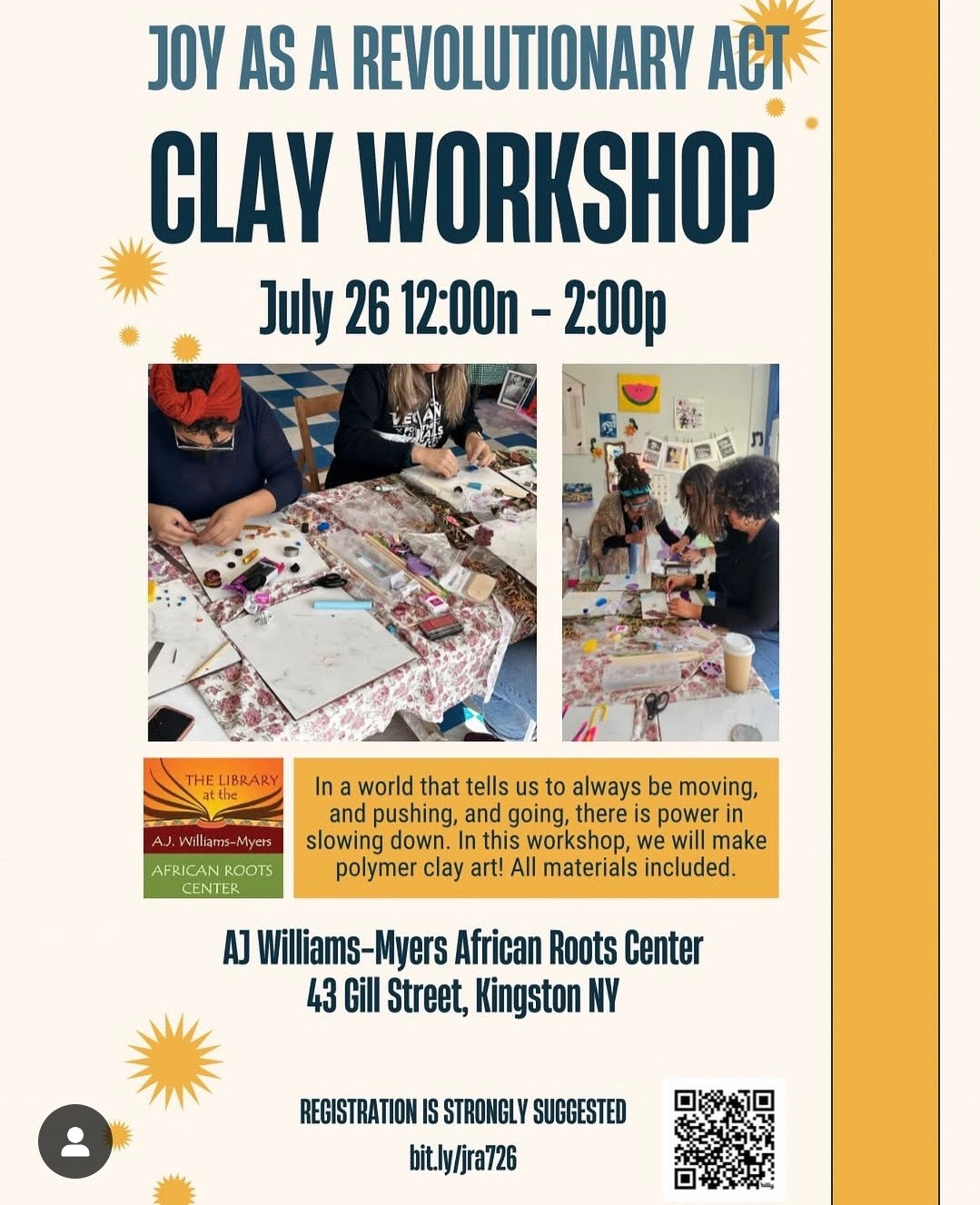 All materials included. Here we focus on the process, not the product. All participants will go home with a finished clay piece or directions to bake it in your oven at home.