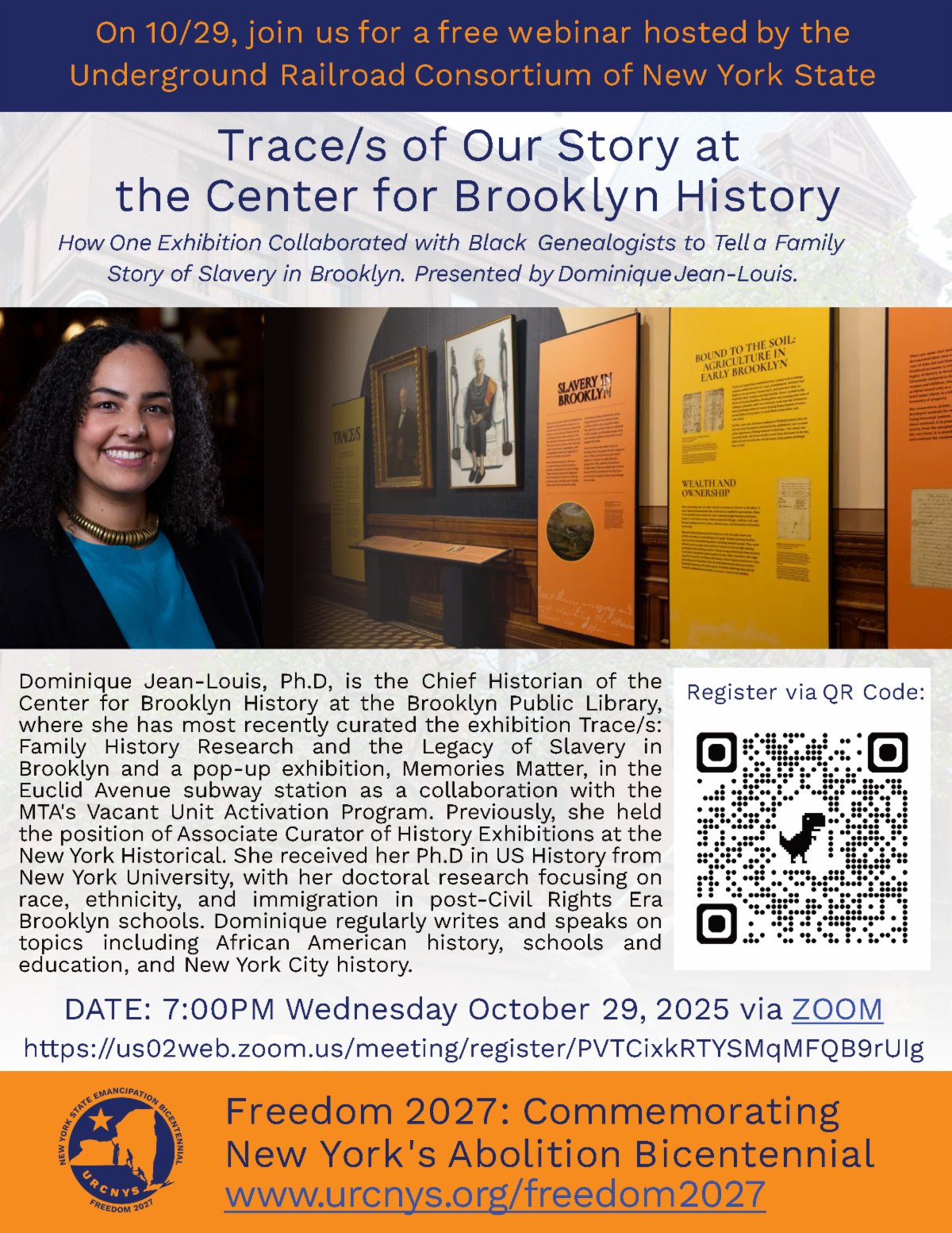 The Underground Railroad Consortium of New York State (URCNYS) is sponsoring a series of free lectures on the topics of enslavement, abolition, and emancipation as a part of its preparation for the upcoming 2027 Bicentennial. Register for the Zoom here!