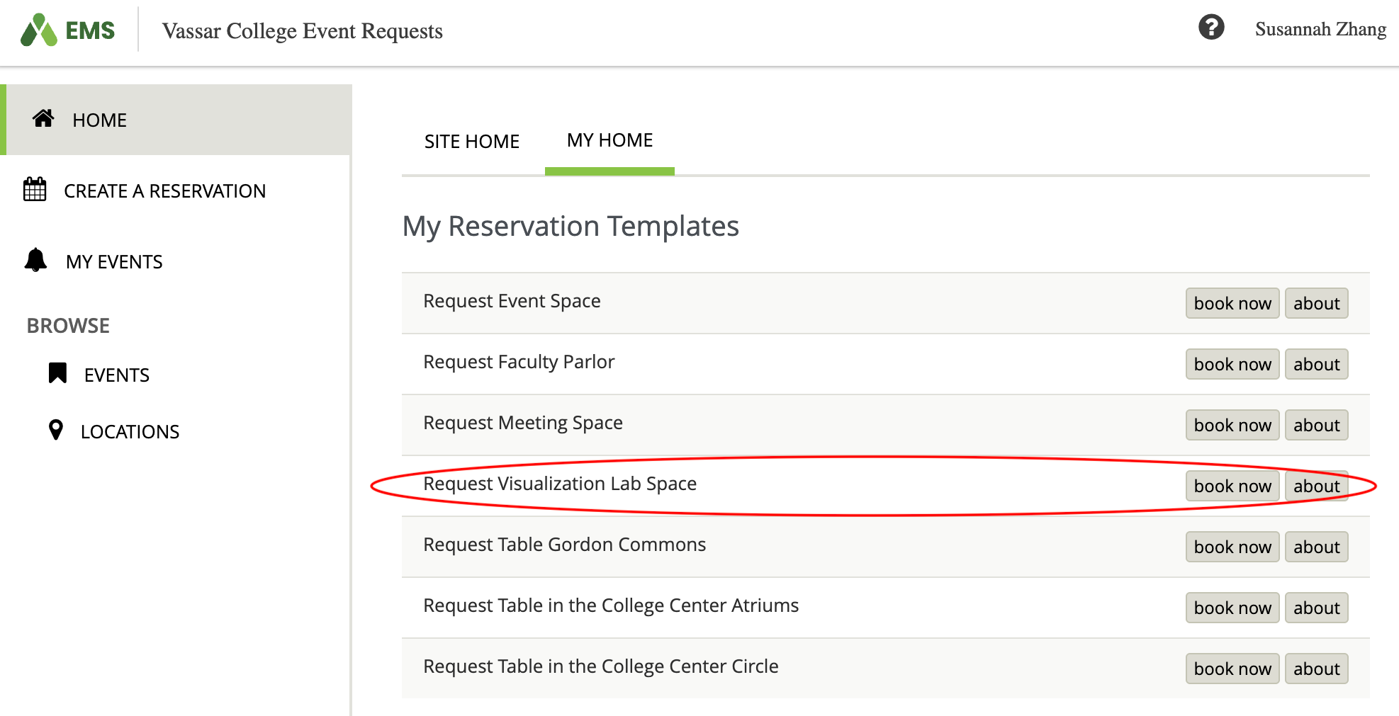If you are a Faculty member who would like to teach a single class/lab period, workshop, hold a meeting, or use the space for some other one-off purpose, please submit your request for approval using the EMS system under the “Request Visualization Lab Space” option (see screenshot below). All reservations must be submitted and approved through the EMS system to officially hold the space, and all Administrative Assistants should have access to this option within their EMS account. If not, contact Campus Activities (campusactivities@vassar.edu) and request this option be added to your EMS account. Please note that course reservations made by the Registrar take priority over all other reservations.
